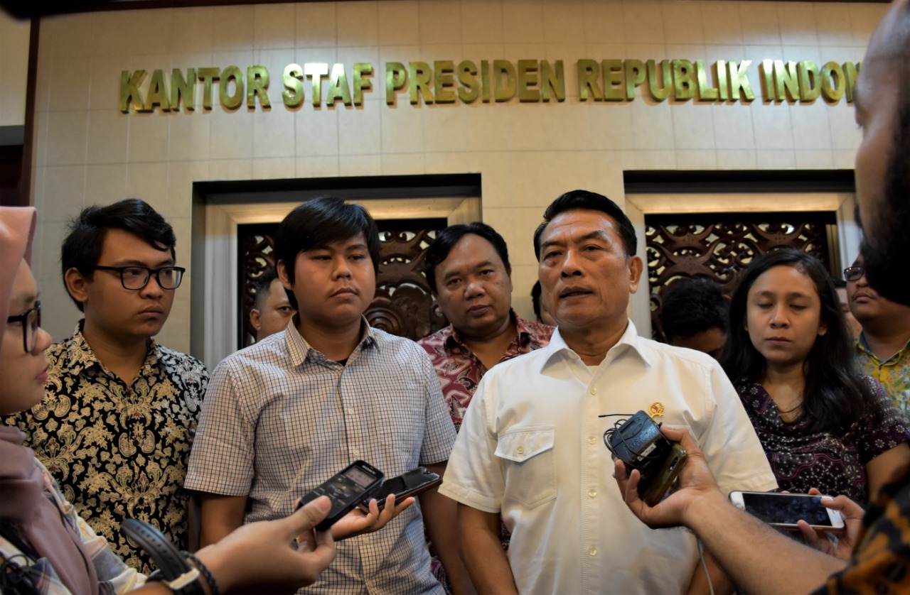 Mahasiswa menemui Kepala Staf Kepresidenan Moeldoko yang didampingi Staf Khusus Kepala Staf Kepresidenan Eddy Soepadmo dan Deputi IV KSP Eko Sulistyo, di ruang rapat utama Kantor Staf Presiden, Senin, 20 Mei 2019.