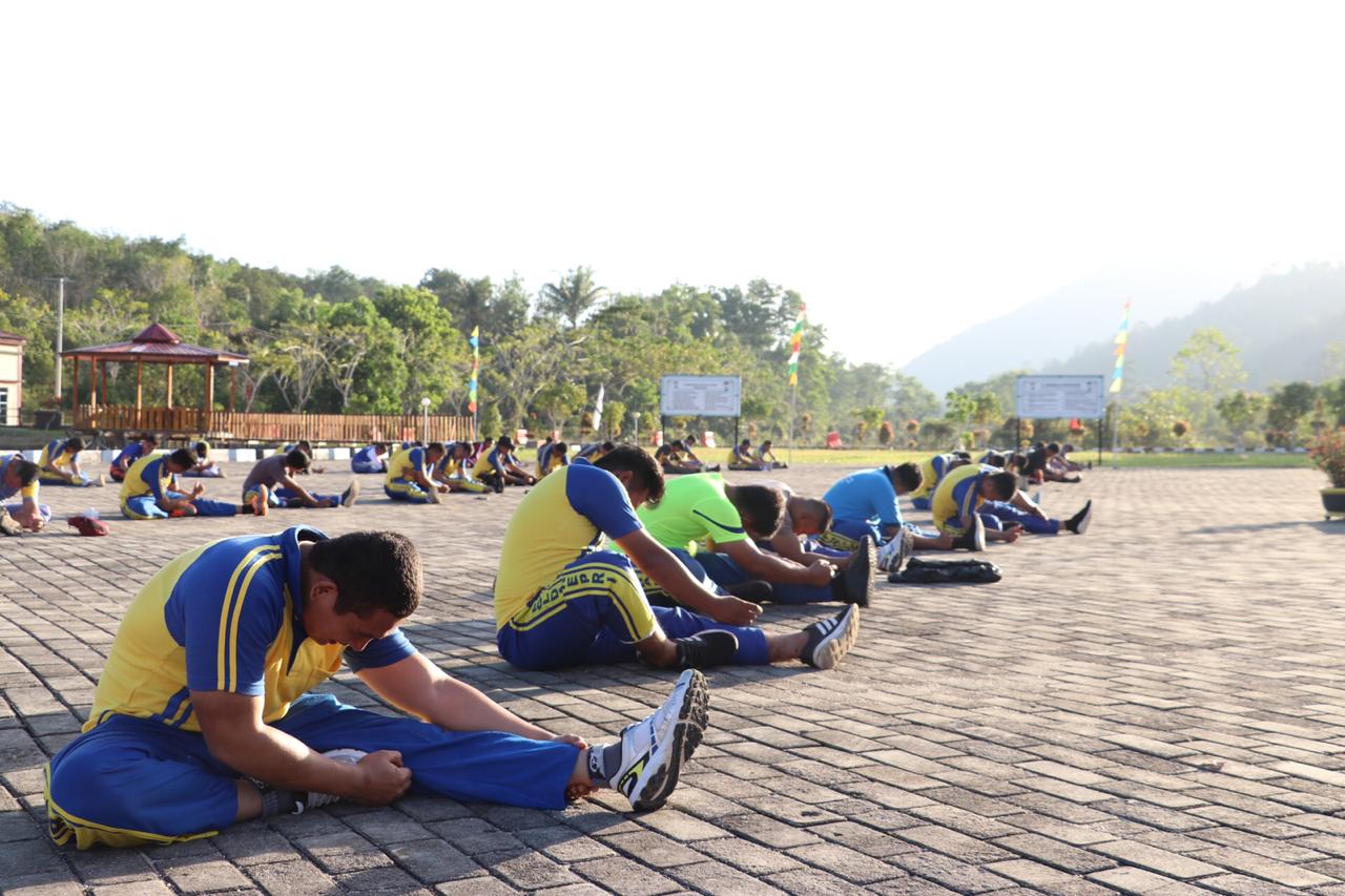 Terlihat, puluhan personil Polres Lingga ikut berolahraga, di halaman Mapolres Lingga, Jumat (26/07).