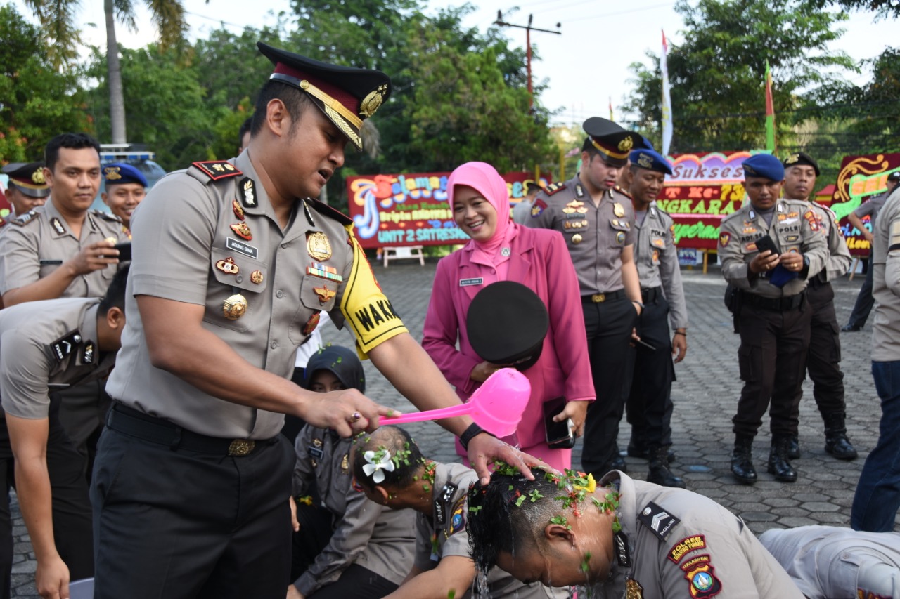 PIJARKEPRI.COM, Tanjungpinang – Tradisi sujud syukur mencium bumi dan penyiraman air bunga mengiringi upacara kenaikan pangkat 34 personel dan PNS Polres Tanjungpinang, di Mapolres Tanjungpinang, Rabu, 3 Juli 2019.