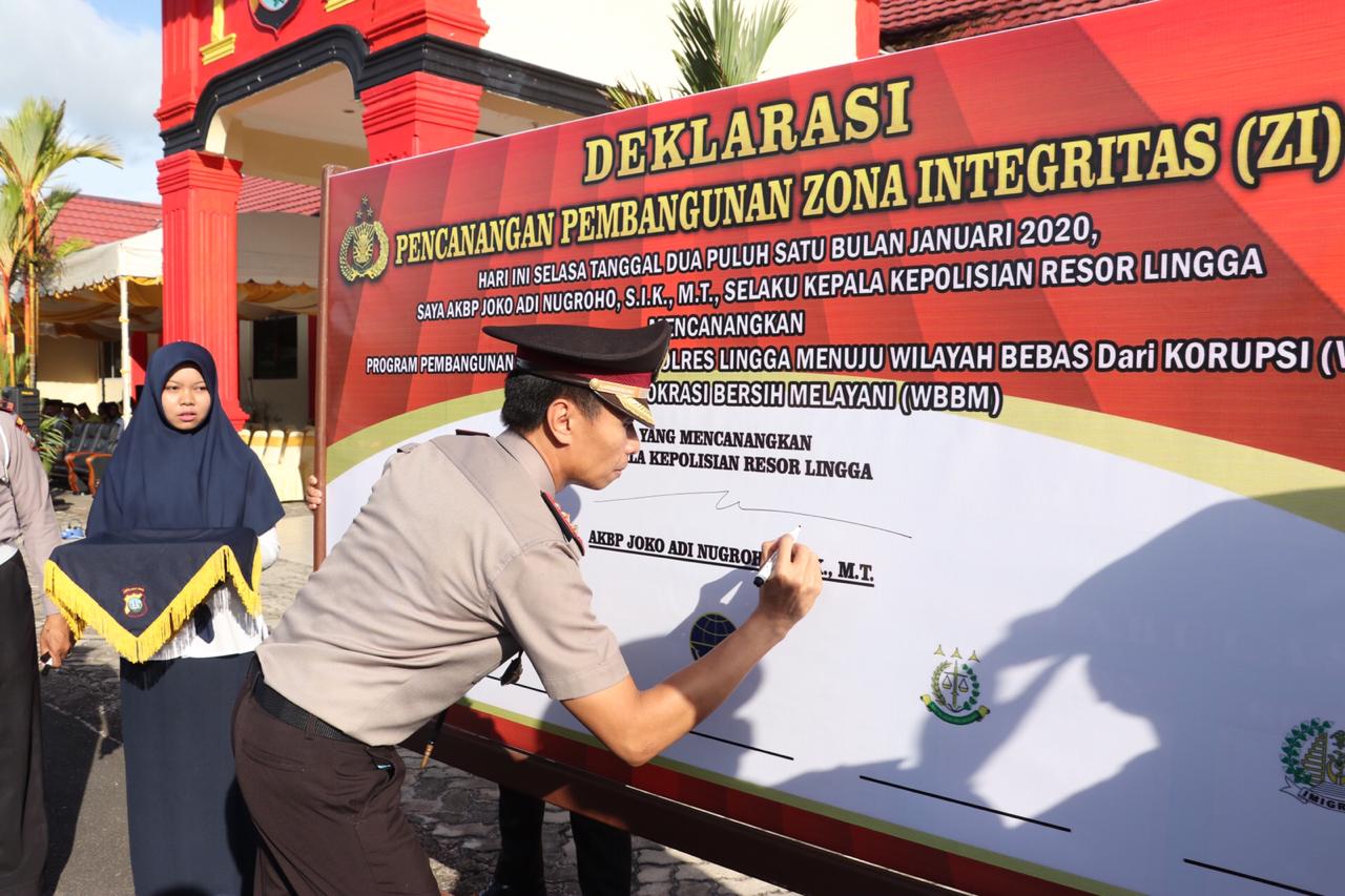 Usai Pelaksanaan Upacara pencanangan pembangunan ZI, dilanjutkan dengan penandatanganan Pakta Intergritas oleh Kapolres Lingga dan Jajaran Forkopimda Kabupaten Lingga, Waka Polres Lingga, Kompol Isa Imam Syharoni, pejabat utama Polres Lingga, Kapolsek jajaran, seluruh anggota Polri serta ASN Polres Lingga.