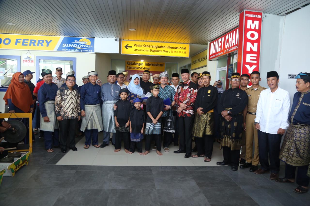 Turis asal Singapura yang tiba, disambut dengan penaburan beras kunyit oleh Ketua Lembaga Adat Melayu (LAM) Kota Tanjungpinang dan pemasangan tanjak ke turis laki-laki, serta pemberian bunga tangan kepada turis perempuan oleh Walikota Tanjungpinang.