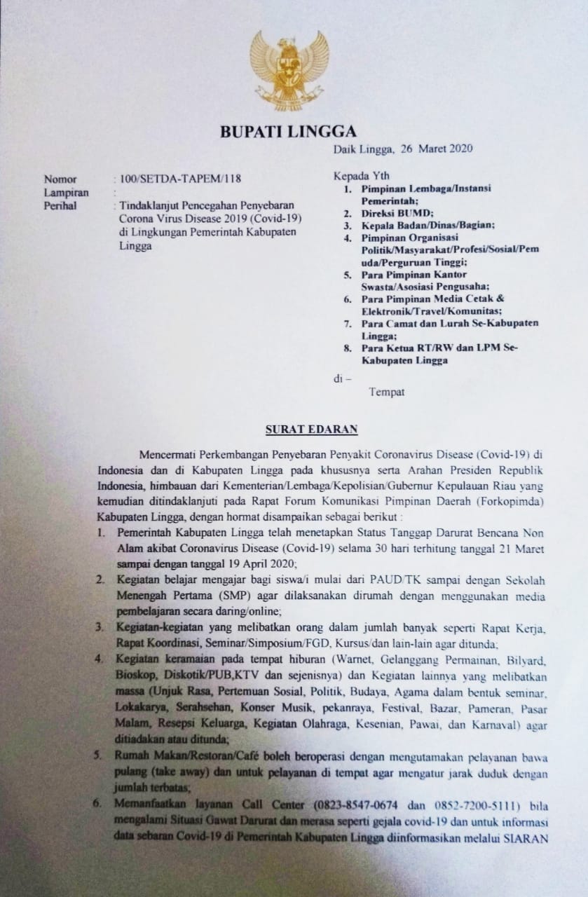 Keputusan itu, diambil Bupati Lingga mencemati perkemangan penyebaran Virus Corona Disease (Covid-19) diIndonesia dan di Kabupaten Lingga pada khususnya, serta mengingat arahan Presiden Republik Indonesia, himbauan dari Kementerian/Lembaga Kepolisian, Gubernur Kepulauan Riau, yang kemudian ditindaklanjuti pada Rapat Forum Komunikasi Pimpinan Daerah (Forkopimda) Kabupaten Lingga.