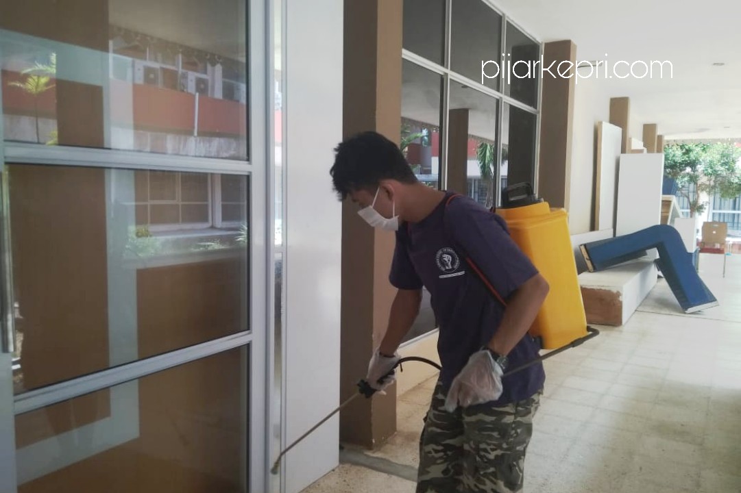 PIJARKEPRI.COM, Tanjungpinang – Relawan Corona Virus Desease 2019 (Covid-19) di Tanjungpinang, Kepulauan Riau menyemprot cairan disinfektan buatan di kantor Kepri Smart Provinsi (KSP) Kepulauan Riau, Rabu (1/4/2020).