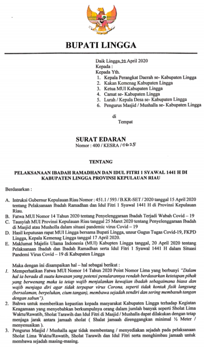 Berikut Surat edaran Bupati Lingga Nomor : 400 / KESRA/0625 tentang pelaksanaan ibadah Ramadhan dan Idul Fitri 1 Syawal 1441 Hijriah di Kabupaten Lingga Provinsi Kepulauan Riau.