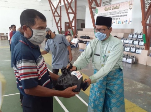 Penyerahan bahan pokok dilakukan secara simbolis kepada 25 penerima terlebih dahulu, yang diserahkan oleh para perwakilan dari donatur dan tahap kedua diserahkan pada sorenya, dengan mengikuti anjuran protokol kesehatan ditengah pandemi Covid-19.