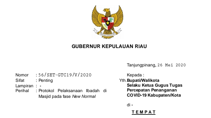 Surat yang ditujukan kepad Bupati dan Wali Kota sebagai Ketua Tim Gugus Tugas itu dalam rangka persiapan pelaksanaan adaptasi perubahan pola hidup pada situasi Covid-19 (New Normal) di Provinsi Kepulauan Riau. Surat itu juga memperhatikan Fatwa MUI Nomor 14 Tahun 2020 tentang Penyelenggaran Ibadah di Saat Wabah Pandemik Covid-19.
