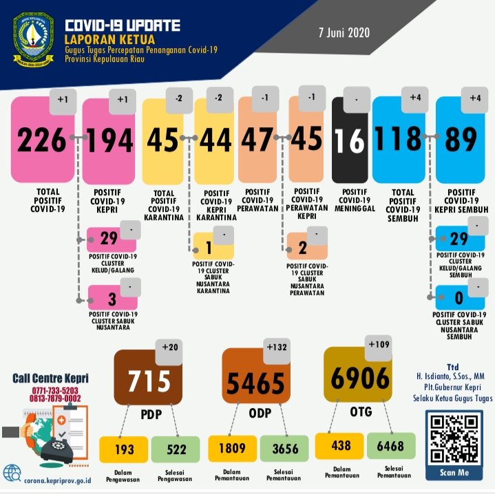 Gugus tugas Percepatan Penanganan Covid-19 Kepri mendata hingga Minggu, 7 Juni 2020, sebanyak 226 orang di Kepri positif Covid-19, 715 orang PDP, 5465 ODP, 6906 OTG.