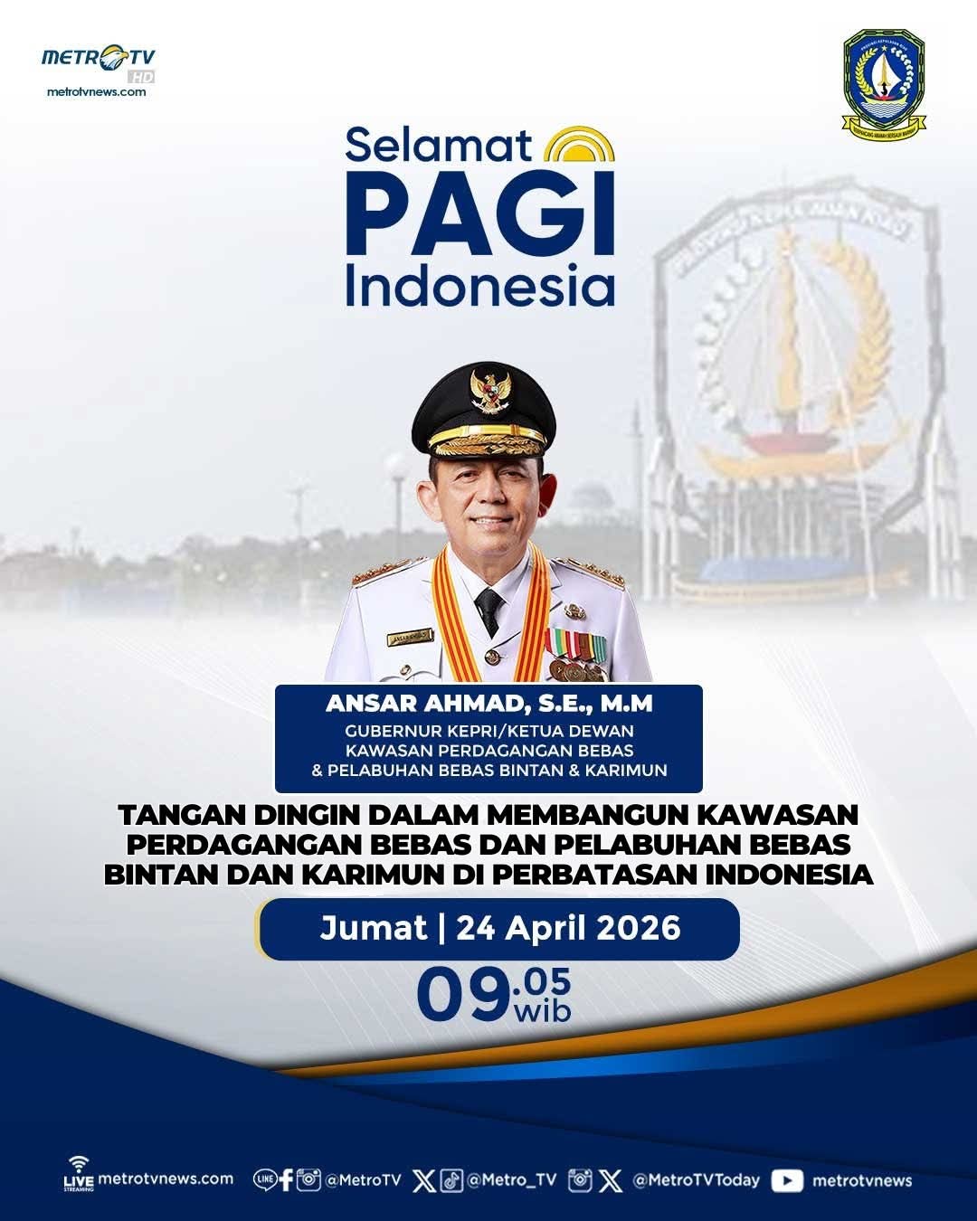 PIJARKEPRI.COM – Gubernur Kepulauan Riau, Ansar Ahmad, dijadwalkan tampil dalam program nasional Selamat Pagi Indonesia yang disiarkan langsung di Metro TV, Jumat (24/4/2026) pagi.
